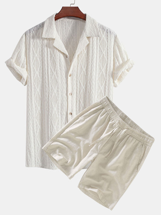 Geometric Jacquard Cuban Shirt with Linen Drawstring Shorts